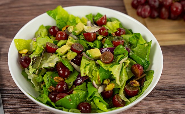 - To make salad: In large bowl, mix greens, grapes and onion. Drizzle with dressing and toss well to coat. Add avocado. Sprinkle with pistachios. Toss lightly.