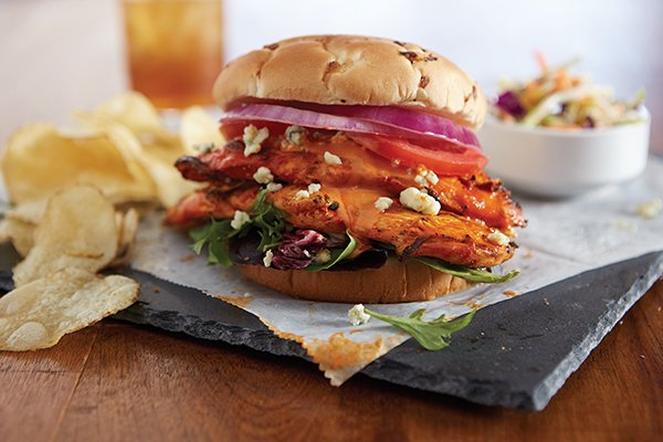 For maximum flavor, each Buffalo chicken sandwich gets a quarter of the bottle of sauce to bring in just the right blend of flavor and heat. Take it to the next level by marinating the chicken in the sauce for at least 30 minutes so it can absorb the unmistakable Buffalo flavor that will send any party into overdrive. Add the tangy blue cheese and cool, crisp lettuce and tomato and you’ve got the perfect bite for a hot summer day.
