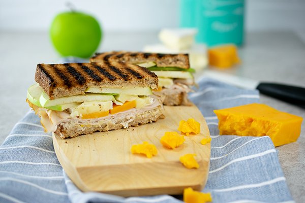 - Layer apple slices, Brie cheese slices, cheddar cheese slices and turkey slices.