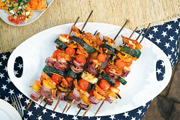 - Build skewers by alternating zucchinis, bell peppers, onions, tomatoes and shrimp, pushing ingredients closely together on each skewer. Brush each with olive oil and sprinkle with sea salt, to taste.