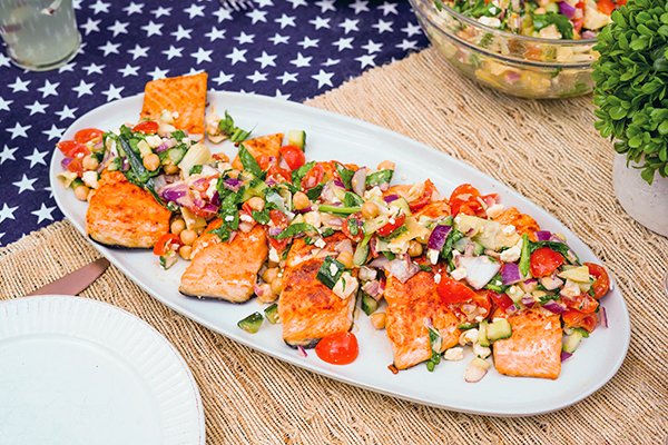 - In medium bowl, make salsa by gently folding together chickpeas, artichoke hearts, cucumber, tomatoes, red onion, feta and spinach. Sprinkle with sea salt, to taste. Drizzle with balsamic glaze and spoon salsa over each salmon filet.