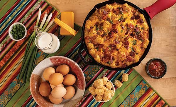 - Layer 1/3 of tater tots on bottom of cast-iron pan; add 1/3 of cooked bacon, 1 cup cheese and 4 ounces salsa; repeat twice to use remaining bacon, cheese and salsa. Pour scrambled eggs on top.