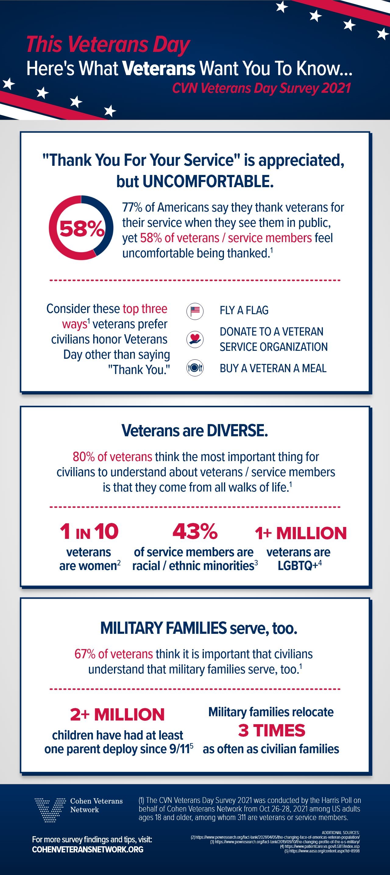 (BPT) - The CVN Veterans Day Survey 2021 explores the military-civilian divide following the end of America’s longest war. The survey by Cohen Veterans Network (CVN), a national network of mental health clinics for post-9/11 veterans, active duty service members and military families, reveals how civilians can go #BeyondTheThankYou to connect with veterans in more meaningful ways this Veterans Day. It additionally captures what veterans want civilians to understand about veterans and military service.