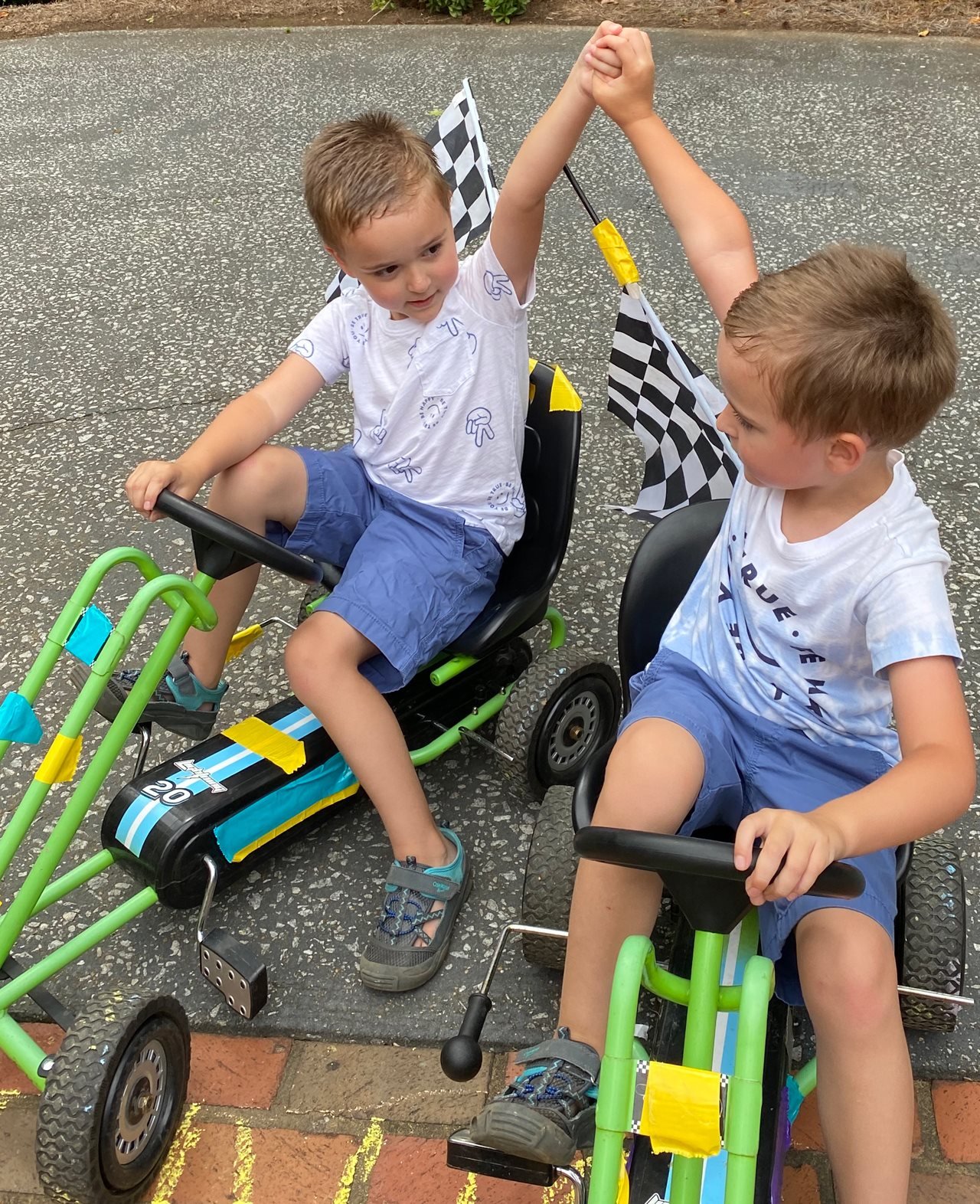 In this variation on the simple chalk drawing, kids use even more imagination by drawing and adding features to a life-sized “racetrack” through which they can ride their bikes, scooters, skateboards, roller blades or battery-operated kiddie cars. The path can wind around your driveway, cul-de-sac or any other paved area that’s safe for kids to ride around on, and it should avoid sharp turns for reasons of safety. Encourage your kids to draw in or otherwise add traffic signs, stoplights, billboards, bridges, ramps, stores, gas stations or other elements that suit their fancy. Camp counselor tip: The drawing part may be easier if you duct tape the chalk to the end of a broom or pole first.