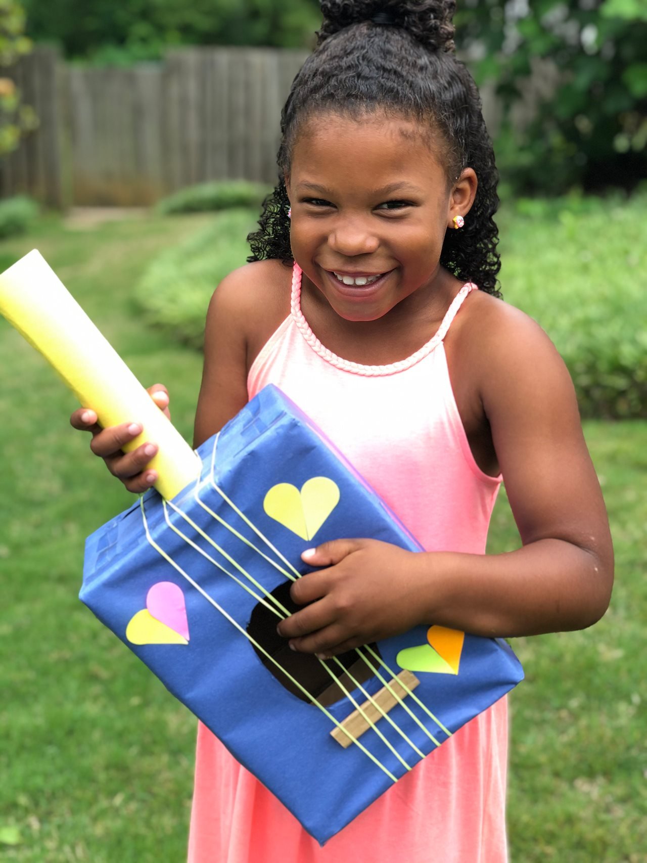 DIY rock-and-roll guitars are easy to make with construction or wrapping paper in assorted colors, tape, rubber bands, glue, empty paper towel rolls and scissors — and everyone can customize their own if you provide stickers, sequins, beads and other glue-on bling. Start with a guitar-sized rectangular box and a paper towel roll that can represent the body and neck, using tape or glue to cover each with decorative paper. Cut an oval-shaped hole in the body, tightly stretching five rubber bands across the hole enough so they twang convincingly. After cutting a small circular hole on the topside of the box, slide in the paper towel tube as the neck. Finally, glue a pencil or elongated cardboard piece under the “strings” to create better sound. Now plan out the national tour for your family band.
