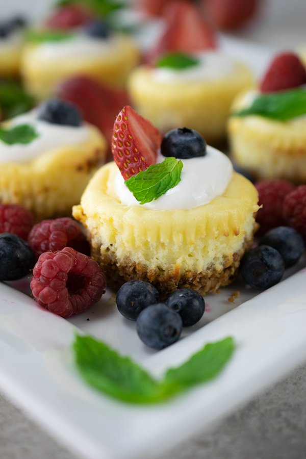 - Spoon mixture evenly into muffin cups. Bake 20-22 minutes until cream cheese mixture is set. Remove from oven and cool in tins about 10 minutes. Transfer to wire rack and cool completely. Place in refrigerator and chill completely before serving or decorating with yogurt, strawberries, raspberries, blueberries, mint, coconut flakes, agave, almonds and lemon zest, if desired.