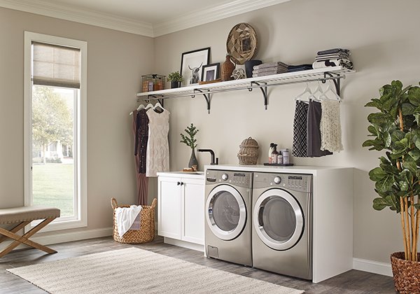 Maximize storage. Many laundry rooms suffer from a lack of storage, which hinders space to fold and manage laundry while making the room less pleasant overall. A durable, attractive organization system like Dimensions by ClosetMaid can add instant organization and style to your laundry room. The system provides numerous design options, convenient accessories and configurations of cabinets and drawers, accommodating virtually any space.