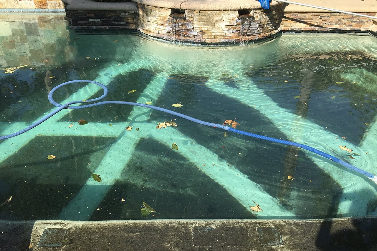 To help prevent staining, remove any debris that may have settled to the bottom of the pool. Vigorously brush the walls, steps and floor of the pool to loosen debris. Then, manually vacuum the pool or use an automatic pool cleaner to remove settled debris. For large amounts of settled ash, you may want to vacuum first, then brush, then vacuum again to avoid stirring up all the fine soot while brushing.