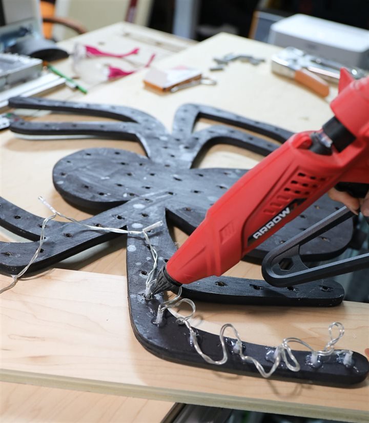 Use the Arrow Fastener glue gun to secure the lights into position where you want them, preventing them from going through too far. Next, the T25 low voltage stapler allows you to secure the wires in place on the back of the spider without cutting into the wires. The rounded T25 staples allow ample room for wires for lighting such as this, which is perfect for holiday and crafting projects where you’re using lights! Gently twist the excess wire and lie the wire loop flat and secure to the wood using the T25 low voltage stapler.