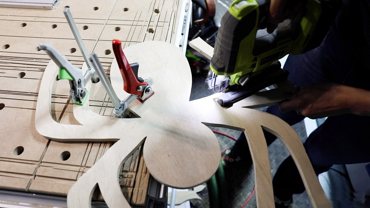 If you’re new to using a jigsaw, be sure to watch or read this tutorial on how to use a jigsaw. The most important thing is to clamp your wood to a workbench or a table, while leaving it hanging off the edge securely (without any movement or shifting), with an open space below, to begin cutting out the spider.